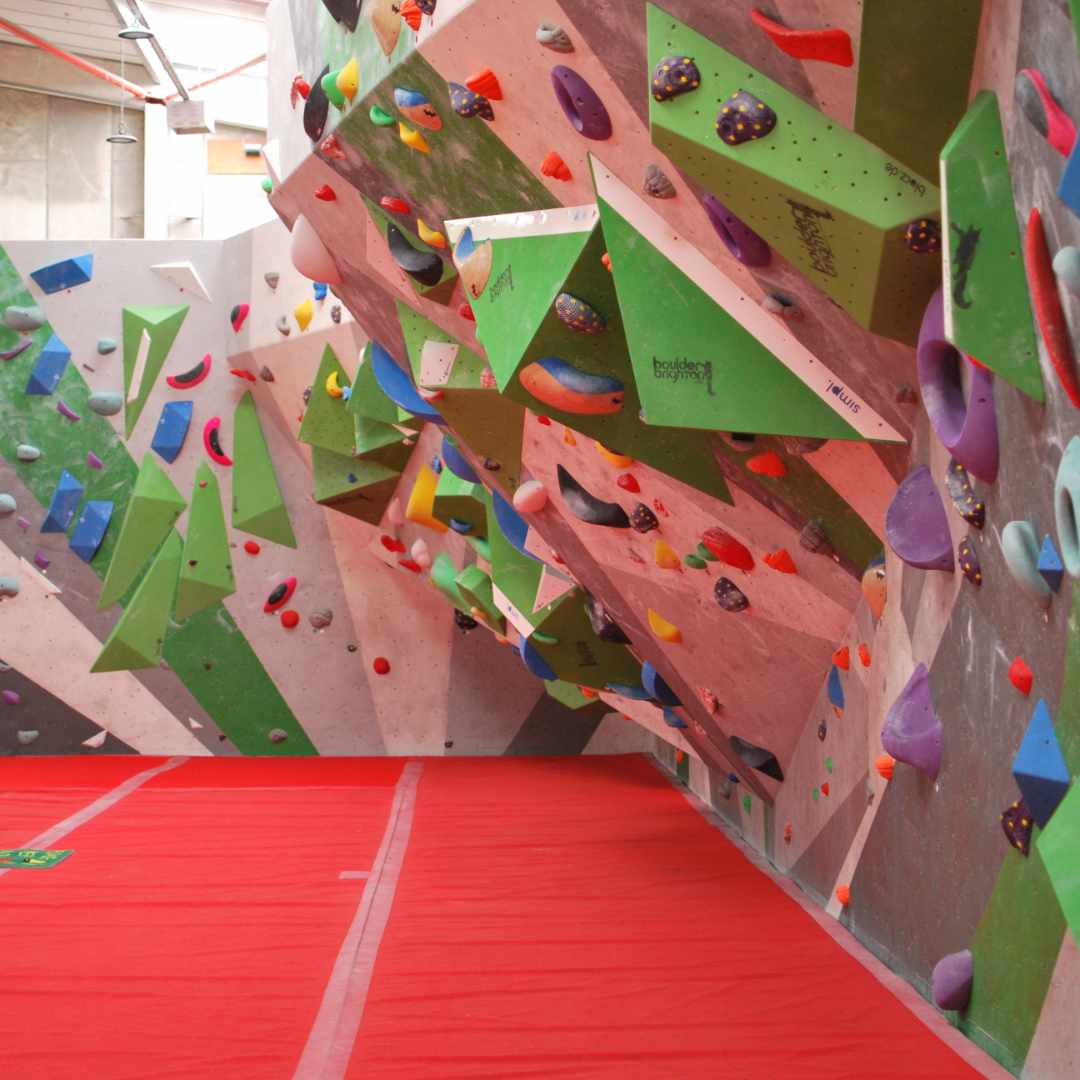 There are walls of every angle at the centre, from slabs to vertical to overhang to roof, from flat walls to corners, to aretes, to our top-out boulder (the Duck!):