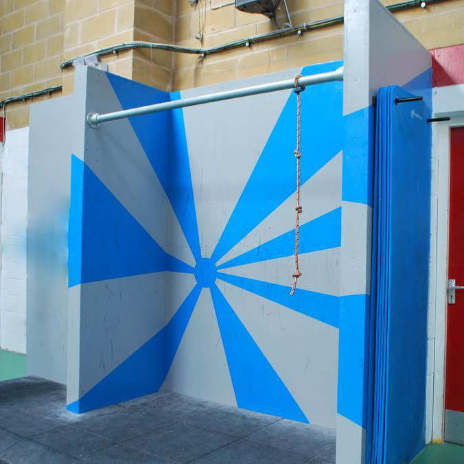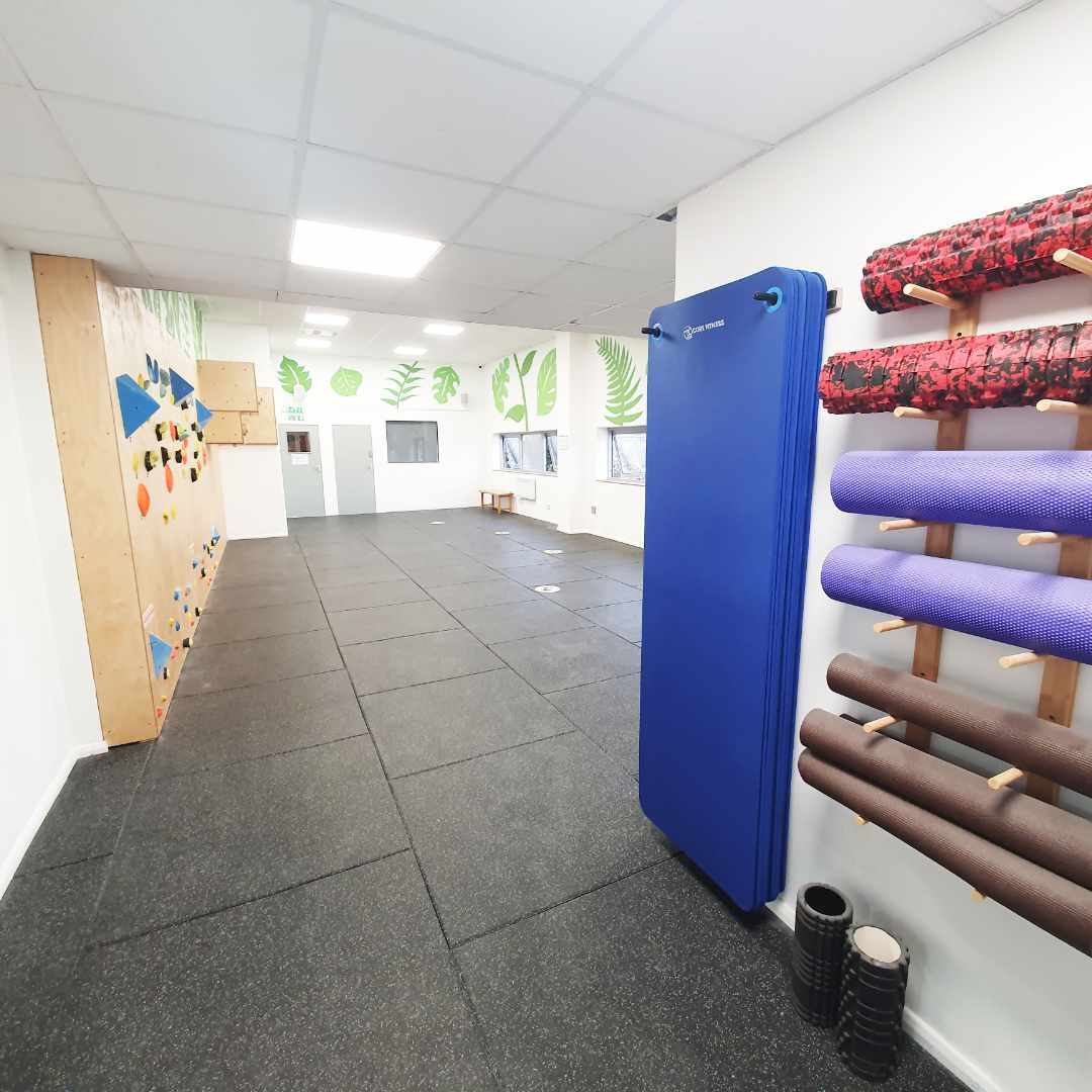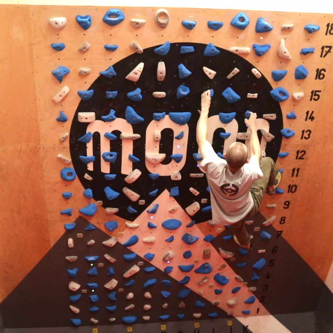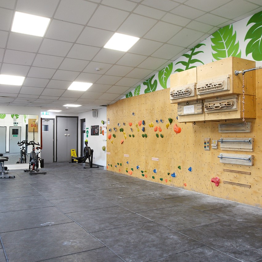 We have a training area on the ground floor with campus rungs, a Moonboard and a light overhang endurance/spray wall.