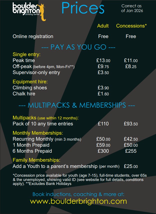 These increases will enable us to keep paying our bills, pay our fantastic staff a decent wage that keeps up with their cost of living, invest in new holds and keep the centre and boulder problems as fresh and regularly updated as everyone has come to expect from us. Look out for an exciting rebuild of the Cave area later in the year!